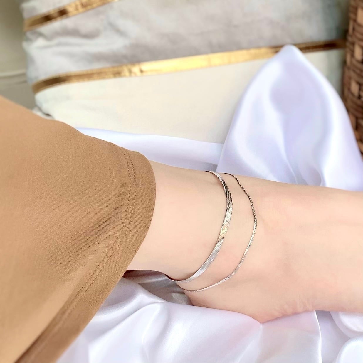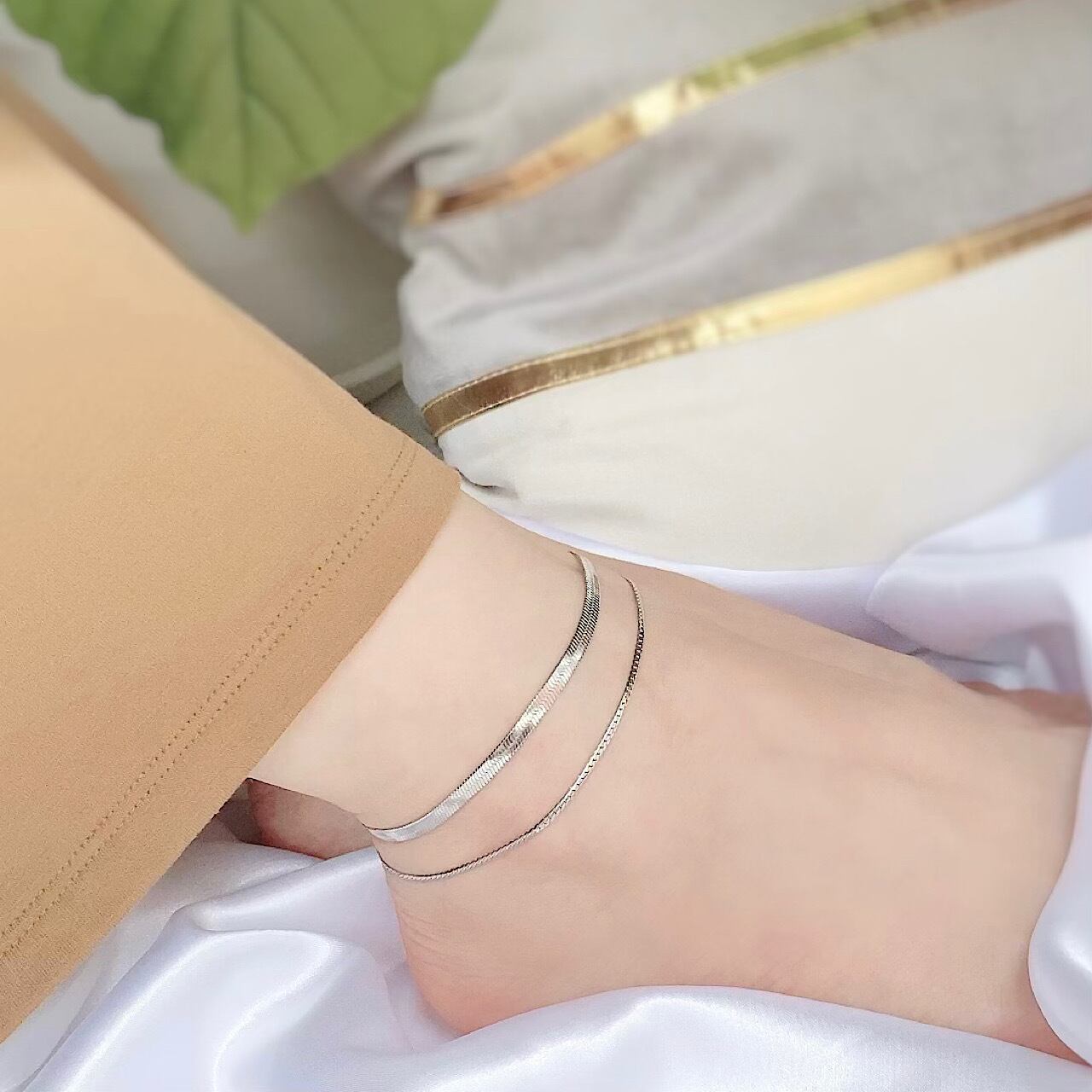 長さの調節や、足首が綺麗に見える重ね付けを